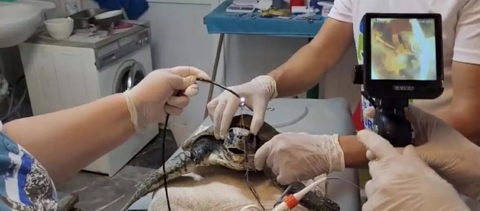 DEKAMER’den yapılan açıklamada, “Duyarlı bir vatandaşın Akyaka’da yüzerken yaralı halde bulduğu ve ‘Pınar Tansal’ ismini verdiği deniz kaplumbağamız ile tanışın. Bulunduğunda yüzgecini sıkan ve ağzından sarkan misinaları vardı Pınar’ın. Birinci olarak yüzgeçlerini kurtardık, akabinde röntgen imajları ile ağzından sarkan misinanın yuttuğu bir metal klipse bağlı olduğunu fark ettik. Merkezimizde endoskopik usulle yapmış olduğumuz müdahaleyle de klips ve misinaları da ağzından çıkardık. Pınar şu an daha memnun. Yaraları iyileşene kadar konuğumuz olacak. Hassaslığı için de bedelli vatandaşımıza teşekkür ederiz” denildi.