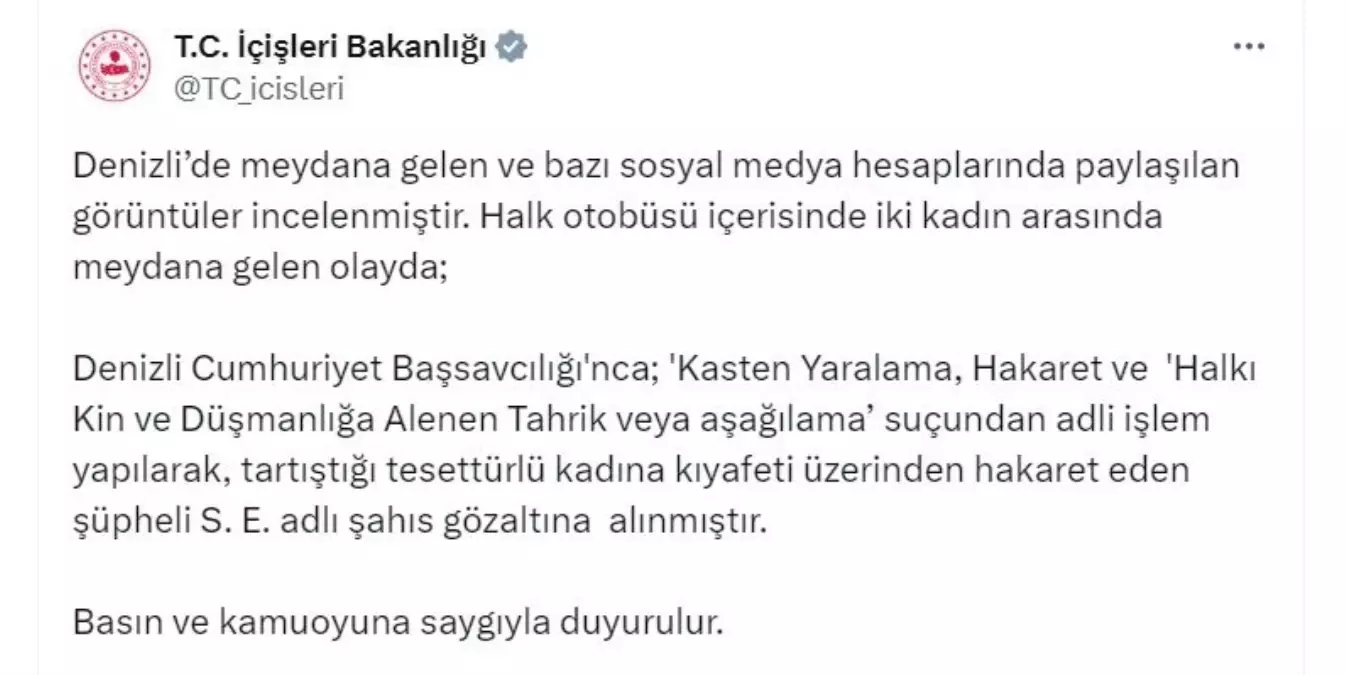 İçişleri Bakanlığı, Denizli‘de iki yolcunun arbede ettiği olaya ait toplumsal medya hesabından açıklama yaptı. Açıklamada, ” Denizli‘de meydana gelen ve birtakım toplumsal medya hesaplarında paylaşılan imajlar incelenmiştir. Halk otobüsü içerisinde iki bayan ortasında meydana gelen olayda; Denizli Cumhuriyet Başsavcılığı’nca; ‘Kasten yaralama, hakaret ve halkı kin ve düşmanlığa alenen tahrik yahut aşağılama’ kabahatinden isimli süreç yapılarak, tartıştığı tesettürlü bayana kıyafeti üzerinden hakaret eden kuşkulu S.E.adlı şahıs gözaltına alınmıştır” denildi.